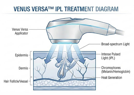 Venus Versa™ IPL delivers precise bursts of light energy directly into the deeper layers of your skin. This smart technology seeks out and targets the specific pigments causing dark spots and redness. Over the following days, your body naturally clears these imperfections away, revealing a clearer, more uniform complexion.